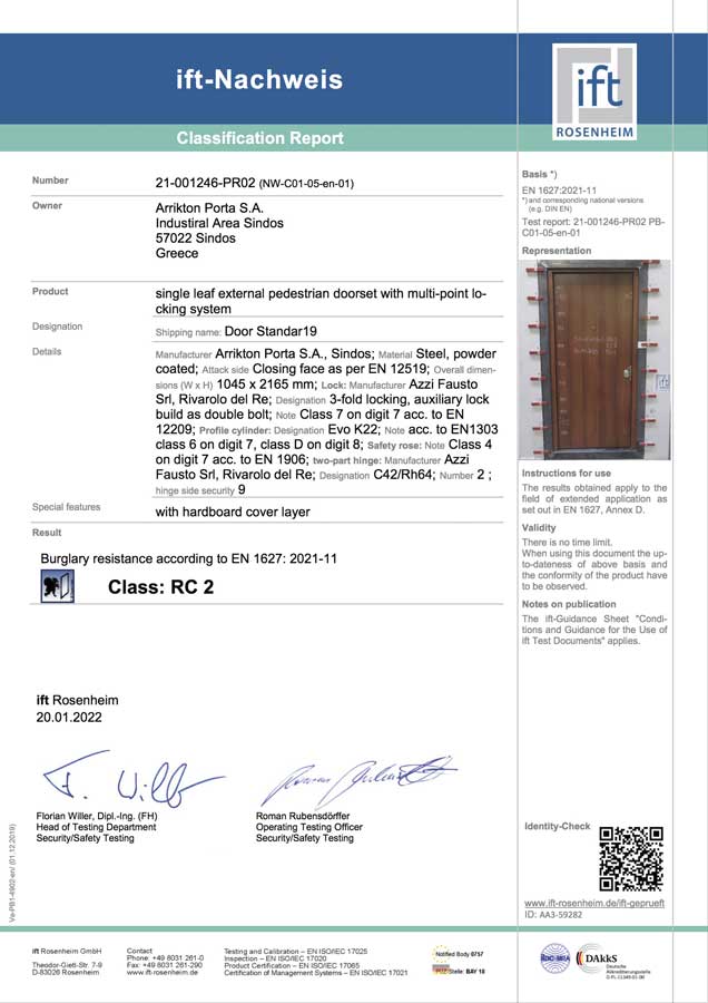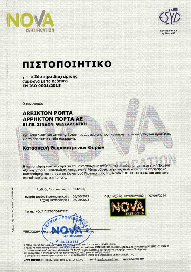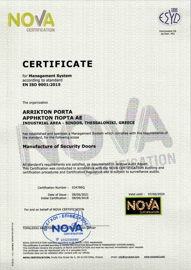 Με πιστοποιημένα υλικά υψηλών προδιαγραφών και εφαρμόζοντας αυστηρά πρότυπα ποιότητας σε κάθε στάδιο παραγωγής, διασφαλίζουμε τη λειτουργικότητα και την ασφάλεια των προϊόντων μας. Οι πιστοποιήσεις και η συμμόρφωσή μας με διεθνή πρότυπα επιβεβαιώνουν την αξιοπιστία και την υπεροχή των προϊόντων μας, προσφέροντας στους πελάτες ασφάλεια και αξιοπιστία σε κάθε πόρτα που φέρει τη σφραγίδα Arrikton Porta.