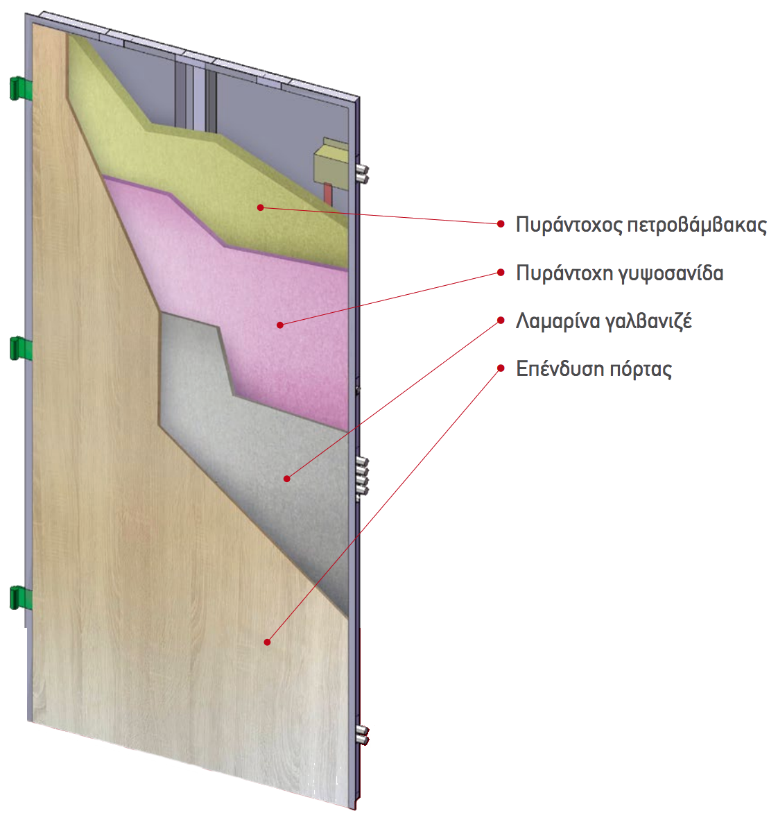Τα παραπάνω υλικά εσωκλείονται με μονοκόμματη εσωτερική λαμαρίνα πάχους 0,8 mm για ενισχυμένη πυροπροστασία και σταθερότητα.
